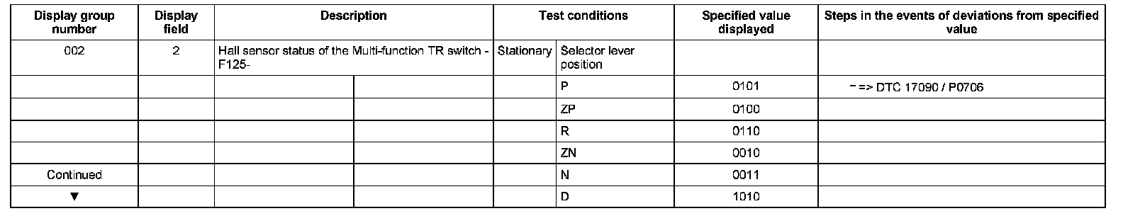 ^ If "0 RPM" is shown in display field 3 or 4, the corresponding sender is faulty and the Transmission Control Module (TCM) must be replaced.