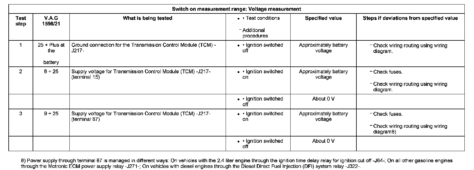 Test table - 01J, Continuously Variable Transmission (CVT)