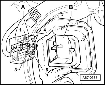 - Disconnect connector - A - from the fresh air blower control module (J126) - B -.