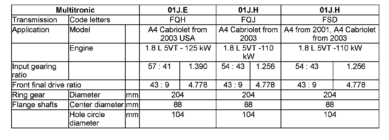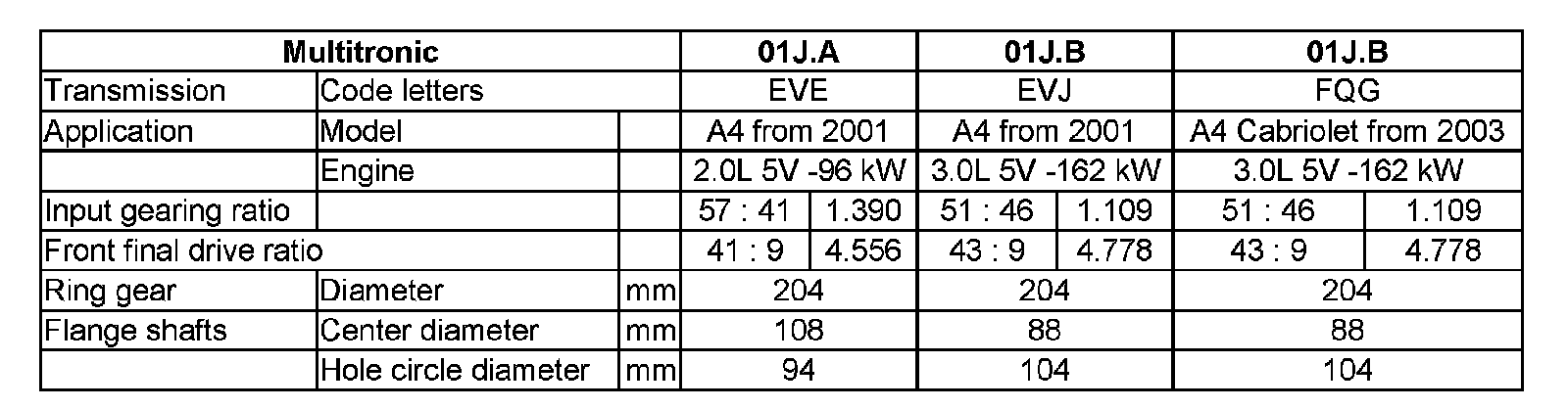 Code Letters, Assembly Allocation, Ratios, Equipment - 01J, Continuously Variable Transmission (CVT)