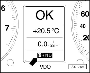 1. The trouble code is stored and a substitute program allows the vehicle to continue to be driven (with some limitations). The driver is not alerted to this condition, since it is not critical to safety nor for the transmission. The transmission range display in the instrument cluster indicates as normal the particular range that has been selected - arrow -. The driver may notice a difference in vehicle driveability and contact an authorized dealer.