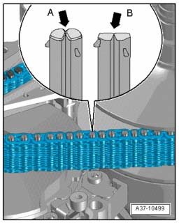 - If the shape of the chain bolt has been worn down through wear or chain-slip to sharp edges - arrow B -, then the chain must be replaced.