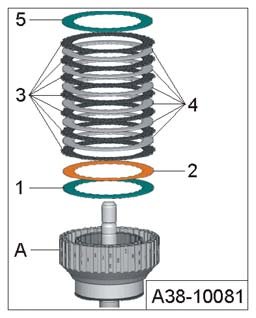 - Remove all adjustment discs, lining discs, outer discs and the corrugated spring washer - 5 -, - 4 -, - 3 -, - 2 - and - 1 - from input shaft cylinder - A -.