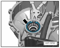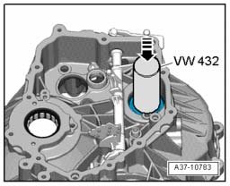 - Remove bearings "D" and "E" for disc set "I" using thrust piece VW 432 - arrow -.