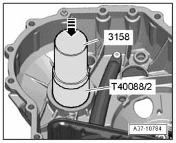 ^ Install bearing "D" (roller bearing for disc set "I") using T40088/2 from assembly tool T40088 and drift sleeve 3158 all the way in - arrow -.