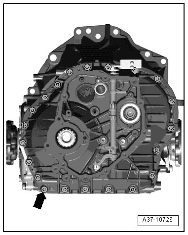 - Remove intermediate housing - arrow -; pay attention to the different length; if necessary, mark the installation position of the bolts.