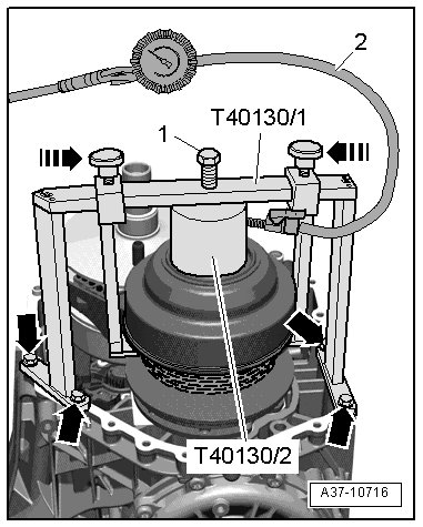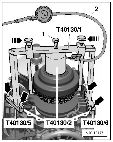 - Center aligning device (T40130/1) to the adapter (T40130/2) and bolt is to the transmission housing- lower arrows -, as illustrated.