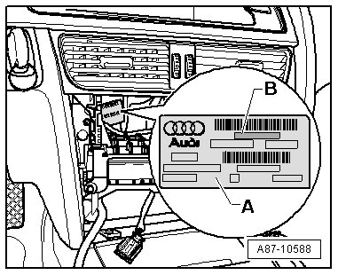 • The part number - B - on the decal - A - can be read when the CD changer is removed (depending on the vehicle equipment level). Refer to the Electronic Parts Catalog (ETKA).