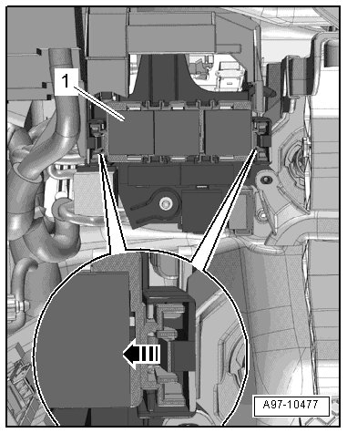 - Disengage the 3-pin relay/fuse panel by pressing the retaining springs in the - direction of the arrow - and remove the relay/fuse panel - 1 -.
