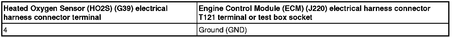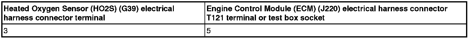 - Using a multimeter, check the Heated Oxygen Sensor (HO2S) (G39) electrical harness connector terminal 3 to the Engine Control Module (ECM) (J220) electrical harness connector T121 terminal 73 for resistance.