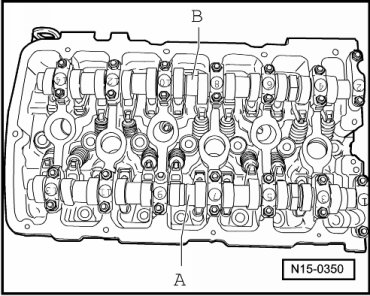 Tighten nuts on exhaust camshaft - B - in 5 stages as follows: