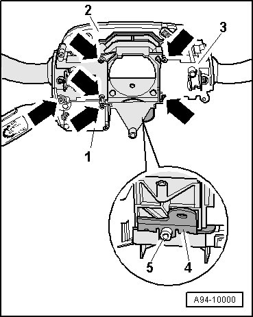 - Pull steering column electronic systems control module (J527) - item 2 - and windshield wiper/washer switch (E22) - item 3 - off from steering column switch module (SCSM).