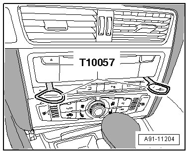 - Insert the two clips from the (T10057) into the slots on the information electronics control module 1 until they engage. Points on the grip eyelets of tool face outward.