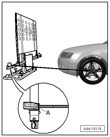 - Position the (VAS 6430) at a distance of - A - 150 cm +/- 2.5 cm from the center of the wheel hub on the front wheels to the beam on the (VAS 6430) as shown in the illustration.