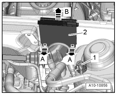 - Tighten the nut - 2 - for the hydraulic oil hose bracket - 1 - to 9 Nm.