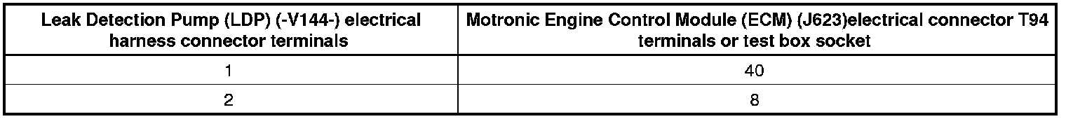 - Using a multimeter, check the Leak Detection Pump (LDP) (-V144-) electrical connector terminals to Motronic Engine Control Module (ECM) (J623) electrical connector T94 terminals.