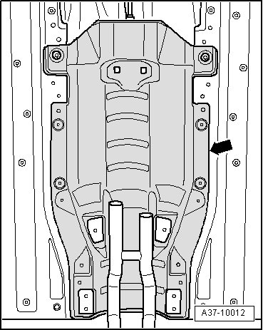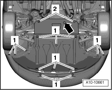 - Remove the rear noise insulation by loosening the fasteners - 2 - and, if equipped the - arrow -.