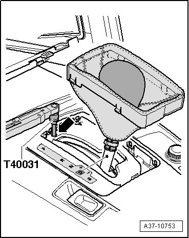 - Through the opening - arrow - in the shift mechanism, loosen the bolt on the selector lever cable approximately one turn using socket and key (T40031).