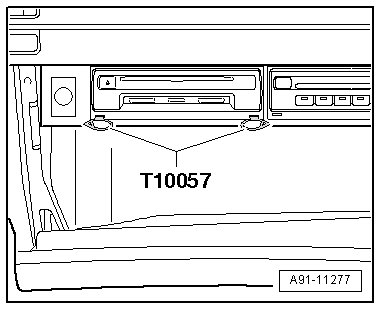 - Insert the two clips from the (T10057) into the slots on the information electronics control module 1 until they engage. Points on the grip eyelets of tool face outward.