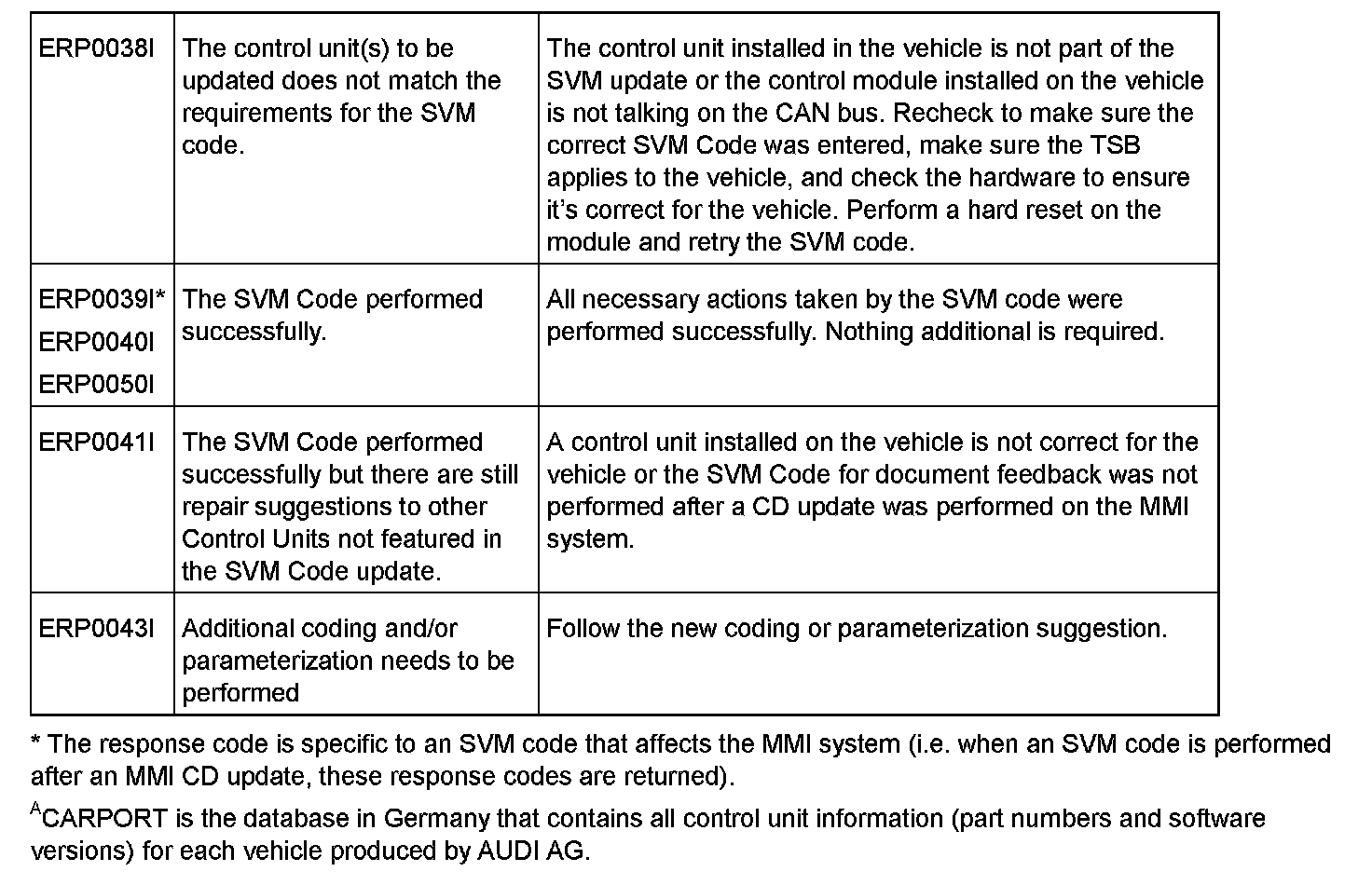 A hardware change suggestion will occur when SVM does not recognize the control module as valid for the vehicle. As stated before, there is a conflict between specified (i.e. reference) and actual hardware/software part number or software versions. If there is no customer concern and no DTC regarding this control module, report the issue then first ensure you have the correct part installed. Then check to see if there is an applicable TSB indicating an SVM XCHG code is required. Finally, if no part issue is found and no supporting TSB is found, then contact the Technical Assistance Center (TAC) with the required information specified in the Additional Information section below. For MMI control units, it is possible the SVM code for feedback documentation was not performed after an update via CD was performed. Always report MMI issues to the TAC before attempting a repair.