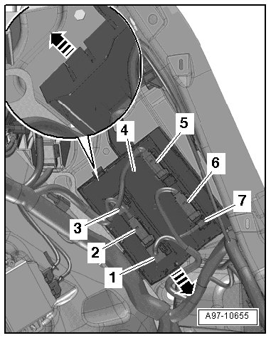- Open the clips - arrows - and remove the comfort system central control module - 4 - from the retainer.