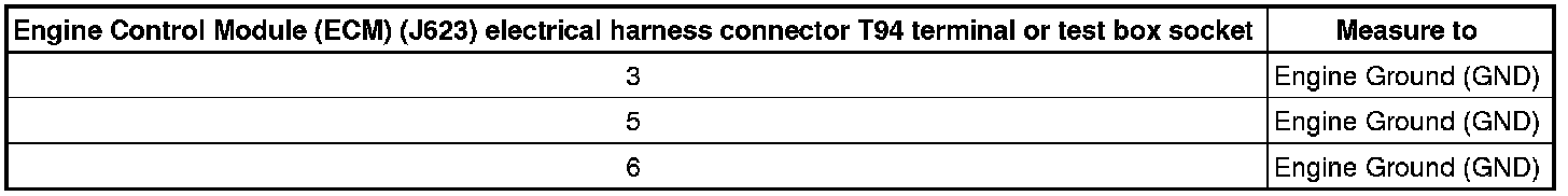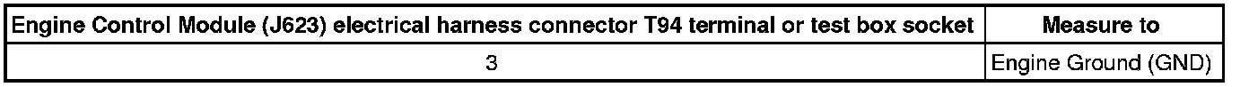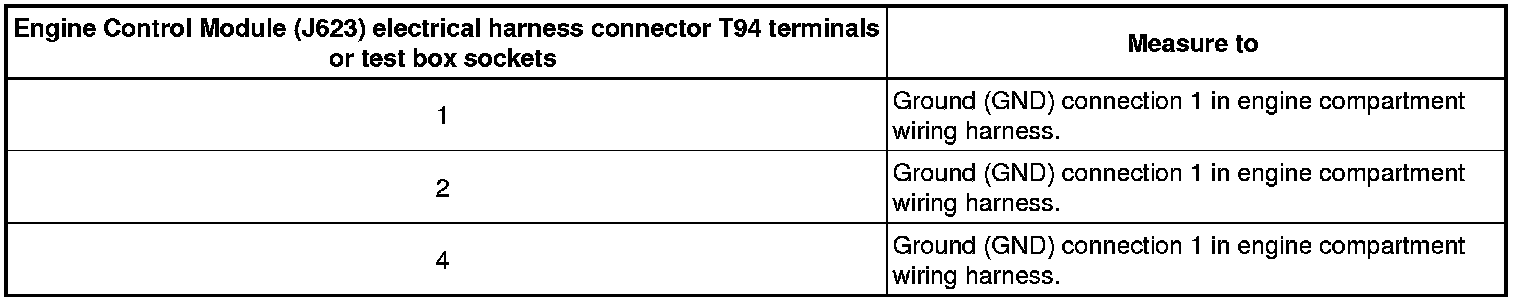 - Check the Engine Control Module (J623) electrical harness connector T94 terminal 3, 5, 6 to the Engine Component Power Supply Relay (J757) socket 4 for an open circuit or short to Ground (GND).