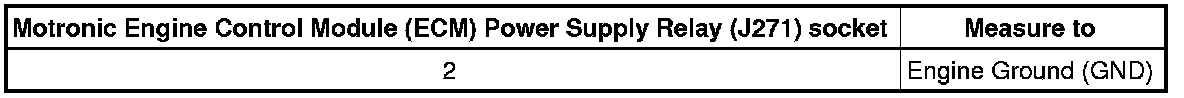 - Using a multimeter, check the Motronic Engine Control Module (ECM) Power Supply Relay (J271) socket 4 to the Fuse 2 (on fuse panel A) (SA2) for an open circuit or short to Ground (GND).