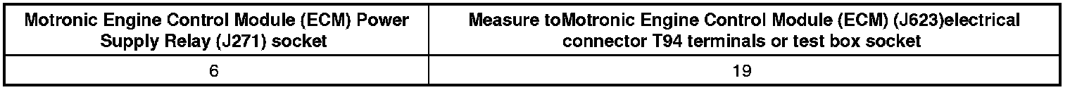 - Using a multimeter, check the Motronic Engine Control Module (ECM) Power Supply Relay (J271) socket 6 to the Engine Control Module (ECM) (J623) electrical harness connector terminal T94/19 for resistance.
