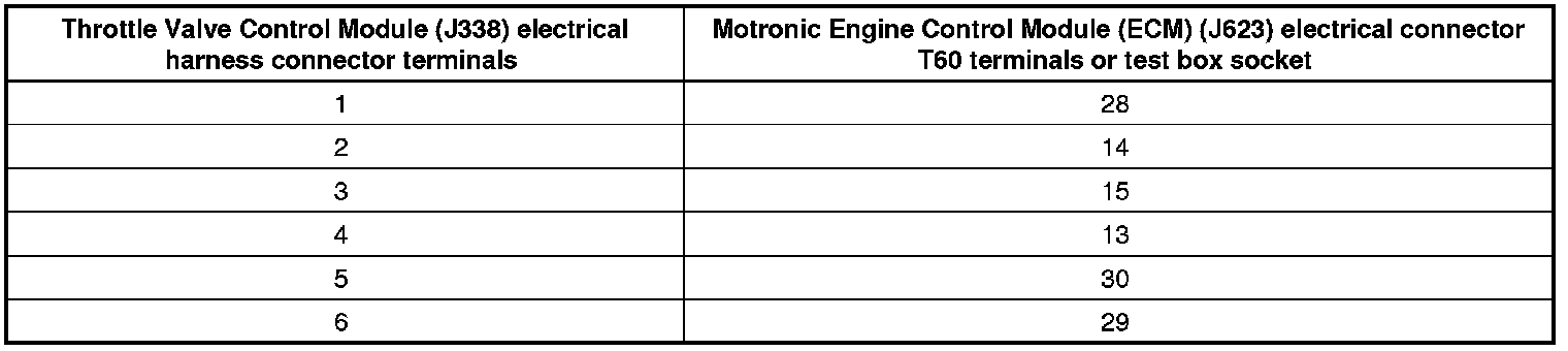 - Using a multimeter, check the Throttle Drive (for Electronic Power Control (EPC)) (G186) at Throttle Valve Control Module (J338) electrical harness connector terminals to the Motronic Engine Control Module (ECM) (J623) electrical harness connector T60 terminals for an open circuit according to the wiring diagram.