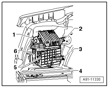 - Loosen the nuts - 1, 2, 3 and 4 - on the infotainment rack - 6 -.