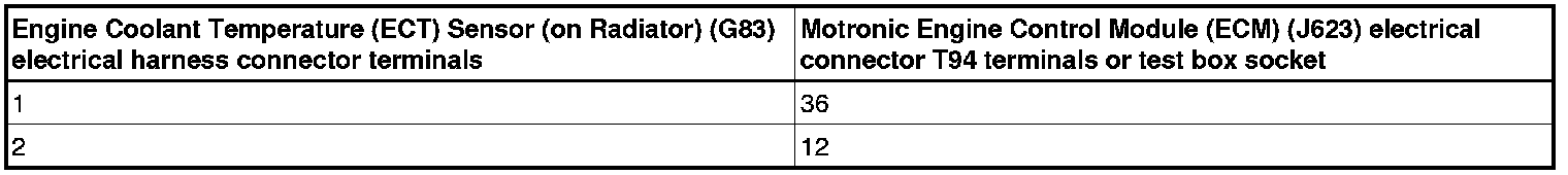 - Using a Multimeter, check the Engine Coolant Temperature (ECT) Sensor (on Radiator) (G83) electrical harness connector terminals to the Motronic Engine Control Module (ECM) (J623) electrical harness connector T94 terminals for an open circuit according to the wiring diagram.