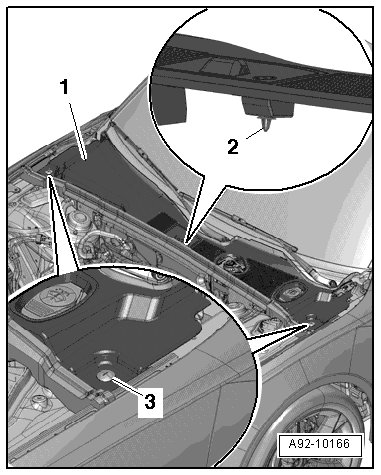 - Remove the clips - 2 - from the mounts and remove the plenum chamber cover - 1 -.