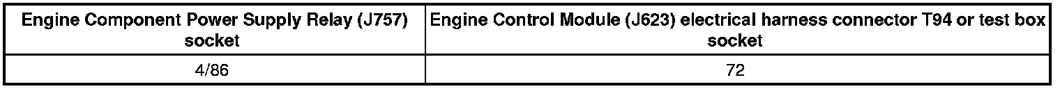 - Check the Engine Component Power Supply Relay (J757) socket 4/86 to the Engine Control Module (J623) electrical harness connector T94 terminal 72 for an open circuit or a short to Battery (+).