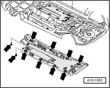 - Remove the right vehicle floor cover - arrows -. Refer to the appropriate service information.