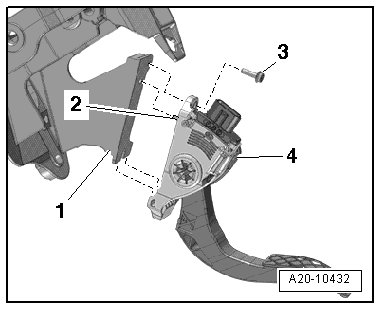 - Engage the accelerator pedal module - 4 - on the bottom of the pedal bracket - 1 -, insert the centering pin - 2 - and tighten the bolt - 3 -.