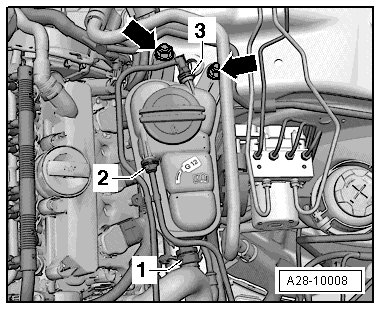 - Disconnect electrical connector to the engine coolant level warning switch (F66) on the bottom of the coolant reservoir and lay the reservoir aside with the coolant hoses - 1 and 2 - and - 3 - attached.
