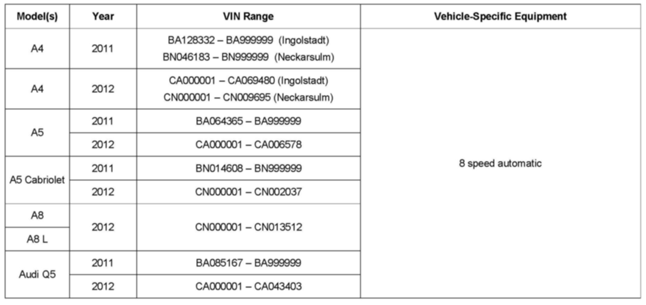 For select A4, A5, A5 Cabriolet, Audi A8 and Audi Q5 VINs: