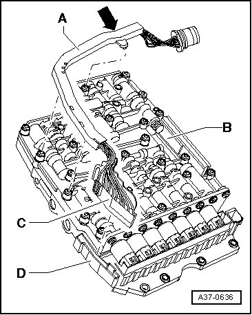 • Installed location: The connector - C - is attached to the wiring harness - A - on the Mechatronic - B -.
