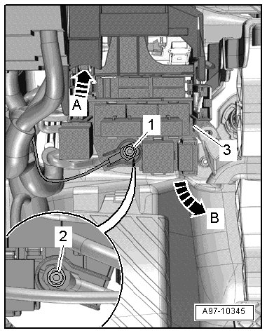 - Release the retaining spring - arrow A - and tilt the 4-pin relay/fuse panel - 3 - out of the mount in the direction of - arrow B -.