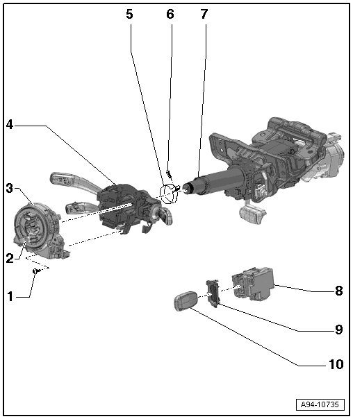 • The steering column switch module consists of coil connector with slip ring, steering angle sensor (G85) , steering column switch (turn signal indicator switch, wiper switch, cruise control switch) and steering column electronic systems control module.
