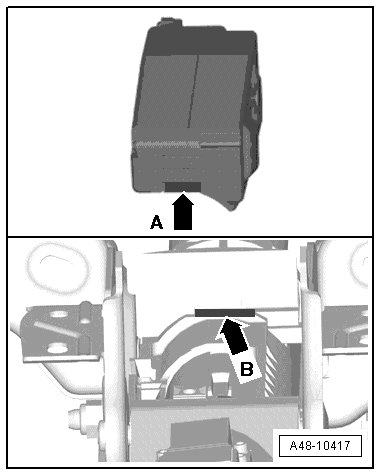 - When installing the electronic steering column lock control module, insert the pins - arrow A - in the groove - arrow B - on the steering column.