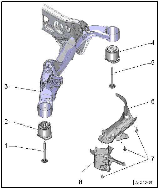 • There are different versions. Refer to => [ Front and Rear Bonded Rubber Bushings ]. For the correct allocation, refer to the Parts Catalog.