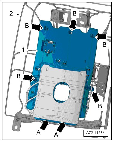 - Unclip and remove the module carrier for the lumbar support - 1 - from the lower seat frame - 2 - - arrows B -.