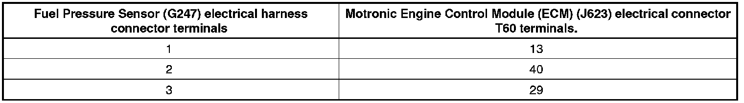 - Using a Multimeter, check the Fuel Pressure Sensor (G247) electrical harness connector terminals to the Motronic Engine Control Module (ECM) (J623) electrical harness connector T60 terminals for an open circuit according to the wiring diagram.