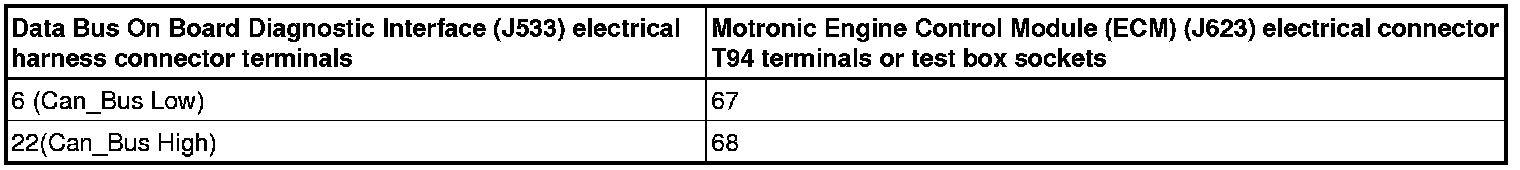 - Using a Multimeter, check the Data Bus On Board Diagnostic Interface (J533) electrical harness connector to the Motronic Engine Control Module (ECM) (J623) electrical harness connector T94 for resistance.