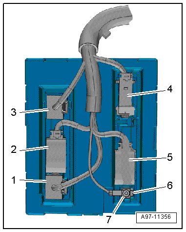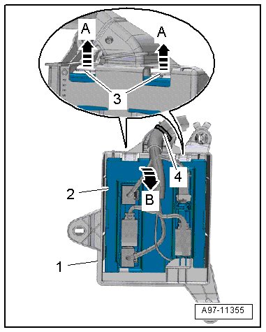 - Open the tabs - 3 - - arrows A - and remove the comfort system central control module - 2 - from the frame - 1 - - arrow B -.
