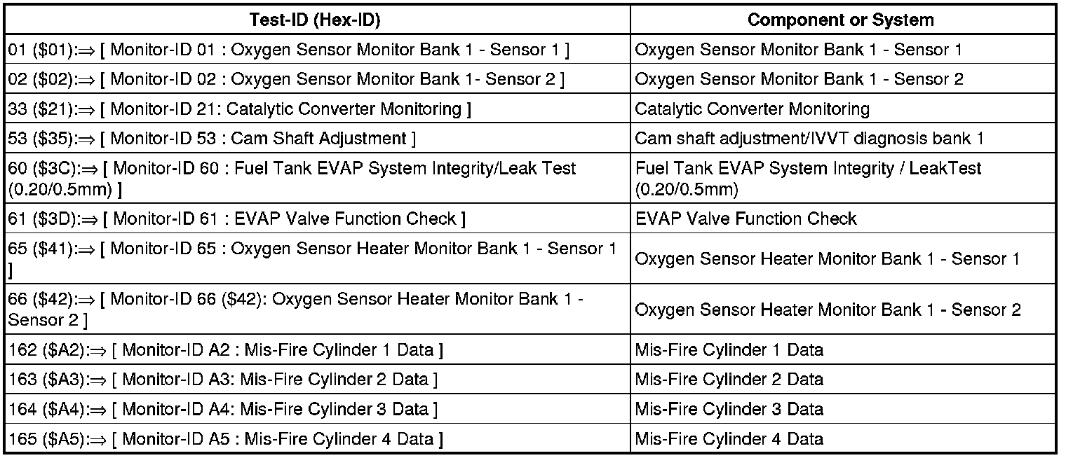 • Depending on the scan tool and protocol used, the information displayed in diagnostic mode 06 may be referred to by different names such as Test-ID (TID), Hex-ID, Component-ID (CID), or On-Board Diagnostic Monitor Identifier (OBDMID).