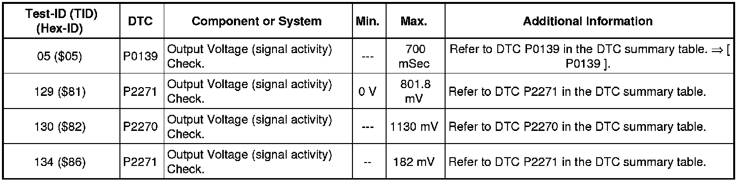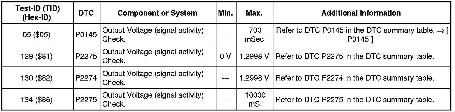 - If any of components or systems fail to meet the specified values. Refer to Diagnostic "Mode 03: Interrogating Fault Memory" to check for stored DTC or the corresponding diagnostic repair procedure => [ Diagnostic Mode 03 - Read DTC Memory ]. Diagnostic Mode 03 - Read DTC Memory
