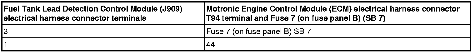 - also check the wiring from the Fuel Tank Lead Detection Control Module (J909) electrical harness connector terminal 3 to the Fuse 7(on fuse panel B) (SB 7) for an open circuit or a short circuit to Ground (GND).
