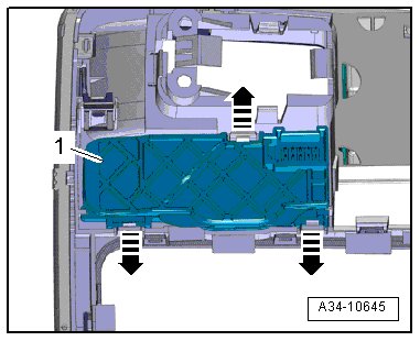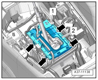 • Installed location: The selector lever sensor system control module and the tiptronic switch are a single unit - 2 -, which is clipped to the selector mechanism function unit - arrows -.